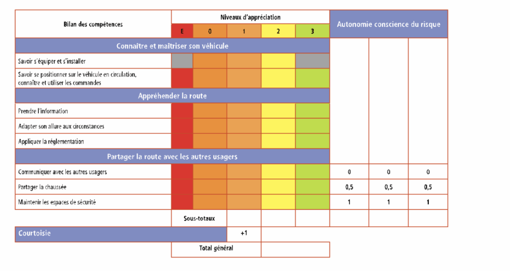 Afin de disposer de repères, quatre grilles de progression accompagnent l’élève dans l’acquisition des compétences indispensables pour la conduite d’une motocyclette.