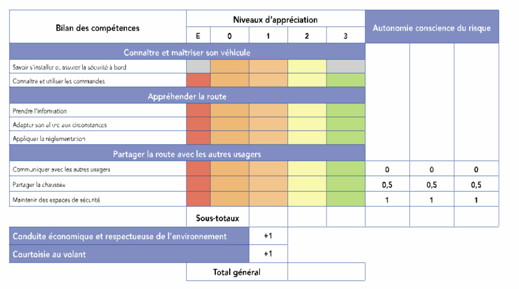 Afin de disposer de repères, quatre grilles de progression accompagnent l’élève dans l’acquisition des compétences. Elles détaillent les savoirs comportementaux, techniques et environnementaux dont doit disposer l’élève conducteur au fur et à mesure de son évolution.