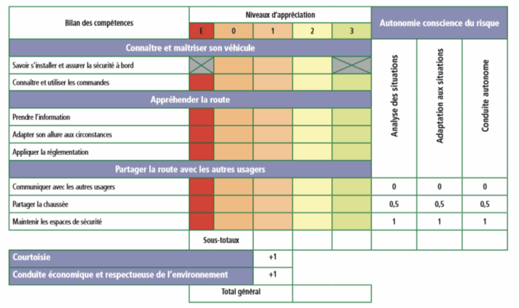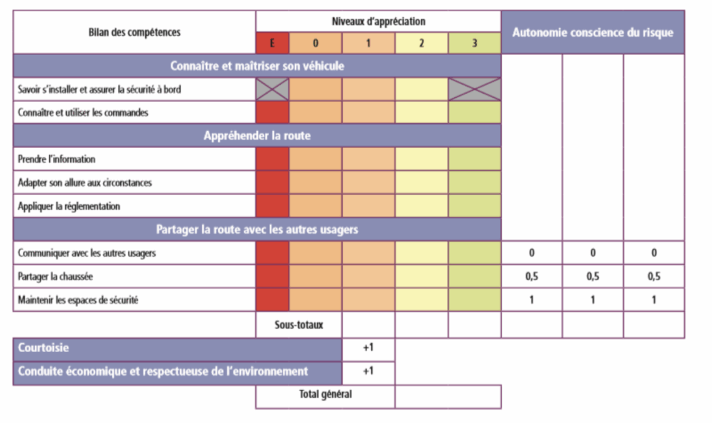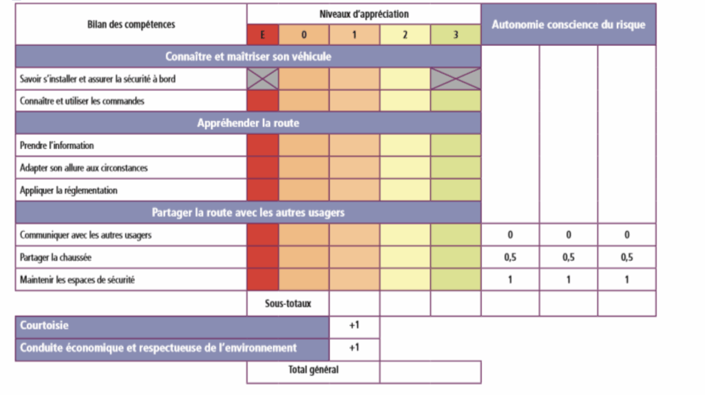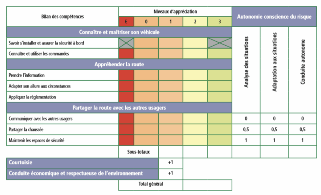 Ces grilles détaillent, pour chaque sous-compétence associée, les savoirs comportementaux, techniques et environnementaux dont doit disposer l’élève conducteur au fur et à mesure de son évolution.